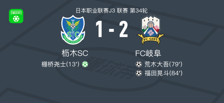 北京时间11月2日,日本职业足球联赛J3联赛第34轮展开较量,枥木SC坐镇主场迎战FC岐阜。比赛中,枥木SC凭借棚桥尧士主罚点球命中,率先取得领先。随后,FC岐阜由荒木大吾攻入一球,将比分扳平。比赛后段,川本梨誉送出助攻,福田晃斗推射得手,帮助FC岐阜实现反超。最终,全场比分定格为枥木SC 1-2 FC岐阜。
