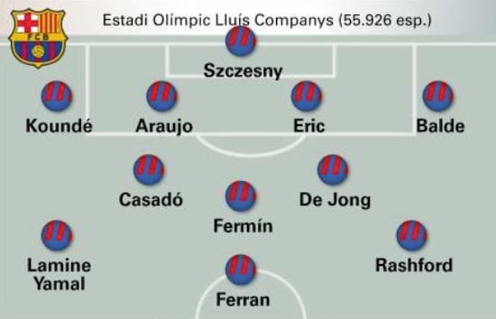 赛前《世界体育报》的报道认为,此战亚马尔、费兰-托雷斯以及拉什福德将会继续组成巴萨的前场三叉戟,卡萨多顶替佩德里,防线上阿劳霍顶替库巴西。