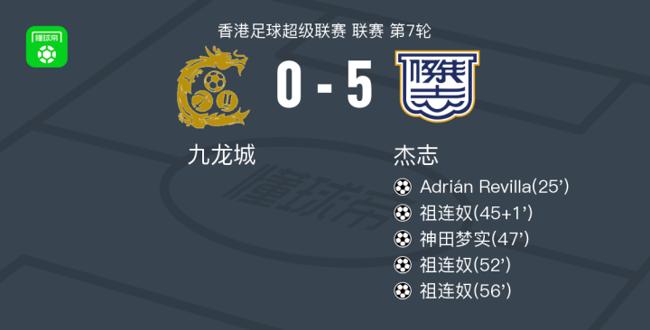 北京时间11月2日,香港足球超级联赛第七轮展开较量,九龙城主场迎战杰志。比赛中,杰志率先打破僵局,Adrián Revilla接队友配合后冷静施射得手。上半场补时阶段,祖连奴抓住机会破门,为球队扩大领先优势。易边再战,神田梦实通过一次精准进攻完成进球,进一步拉开比分。随后,祖连奴接连两次攻破对方球门,完成个人本场比赛的三粒进球。最终,杰志以5比0战胜九龙城。