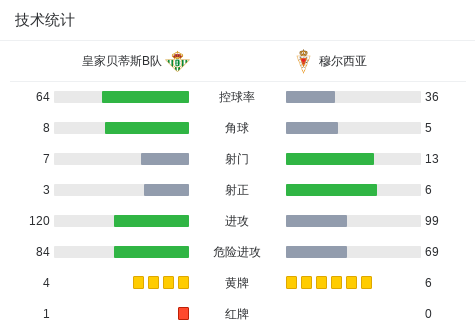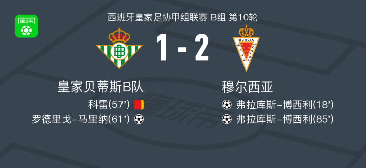 北京时间11月2日,西班牙皇家足协甲组联赛B组第10轮展开较量,皇家贝蒂斯B队坐镇主场迎战穆尔西亚。比赛中,穆尔西亚球员弗拉库斯-博西利率先破门,为客队取得领先。随后,皇家贝蒂斯B队防守压力增大,球队在比赛进程中累计领到多张黄牌,其中科雷因两黄变一红被罚离场。逆境之下,皇家贝蒂斯B队由罗德里戈-马里纳抓住机会扳平比分。然而穆尔西亚并未放弃进攻,弗拉库斯-博西利再度建功,完成梅开二度,帮助球队重新确立优势。最终全场战罢,皇家贝蒂斯B队以1-2不敌穆尔西亚。
