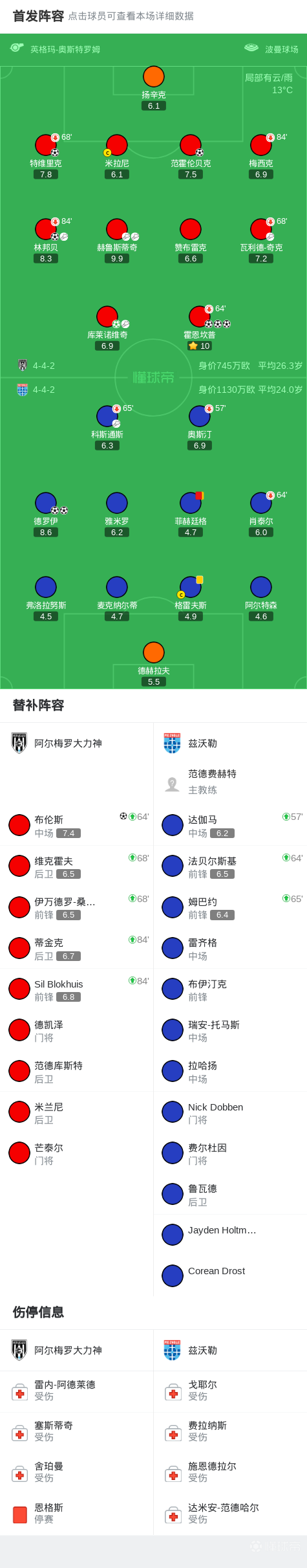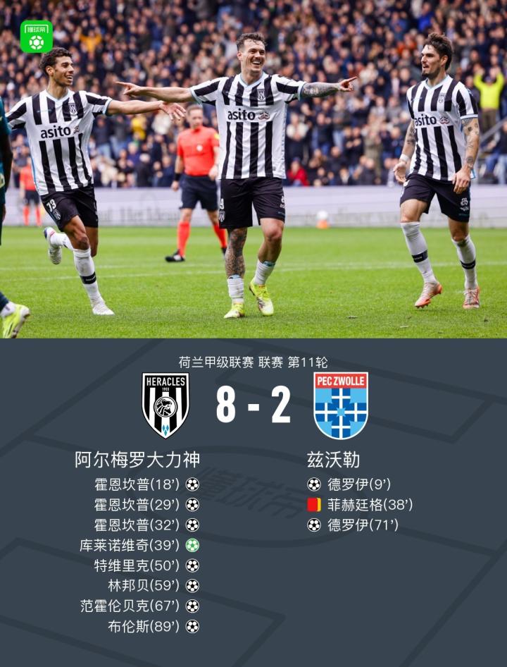 北京时间11月2日荷兰甲级联赛 联赛 第11轮,阿尔梅罗大力神主场对阵兹沃勒。阿尔梅罗大力神霍恩坎普帽子戏法,特维里克破门,林邦贝破门,范霍伦贝克破门,布伦斯破门,库莱诺维奇破门。兹沃勒德罗伊梅开二度。最终比分阿尔梅罗大力神 8-2 兹沃勒。