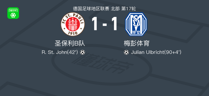 北京时间11月2日,德国足球地区联赛北部赛区第17轮,圣保利B队主场迎战梅彭体育。比赛中,圣保利B队球员R. St. John率先破门,为主队取得领先。随后,梅彭体育球员Julian Ulbricht在下半场补时阶段攻入关键一球,帮助球队客场扳平比分。最终双方以1-1握手言和。