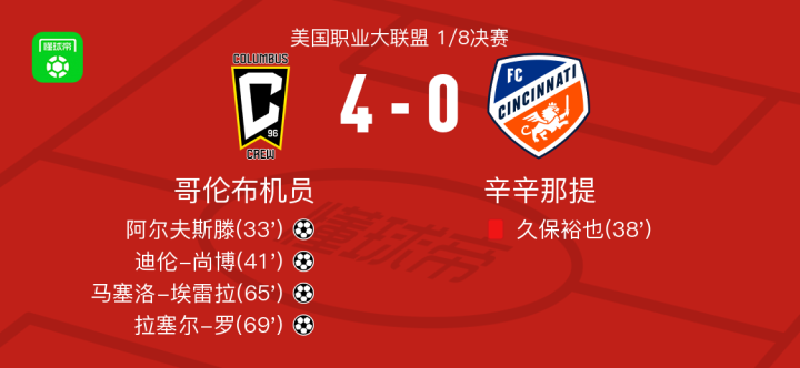 哥伦布机员4-0大胜辛辛那提,拉塞尔-罗替补1传1射,马塞洛-埃雷拉破门