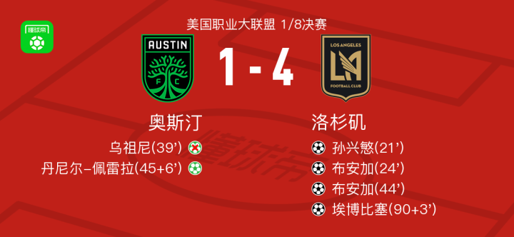 北京时间11月3日美国职业大联盟 1/8决赛,奥斯汀主场对阵洛杉矶。奥斯汀丹尼尔-佩雷拉破门。洛杉矶孙兴慜破门,布安加梅开二度,埃博比塞破门。最终比分奥斯汀 1-4 洛杉矶。