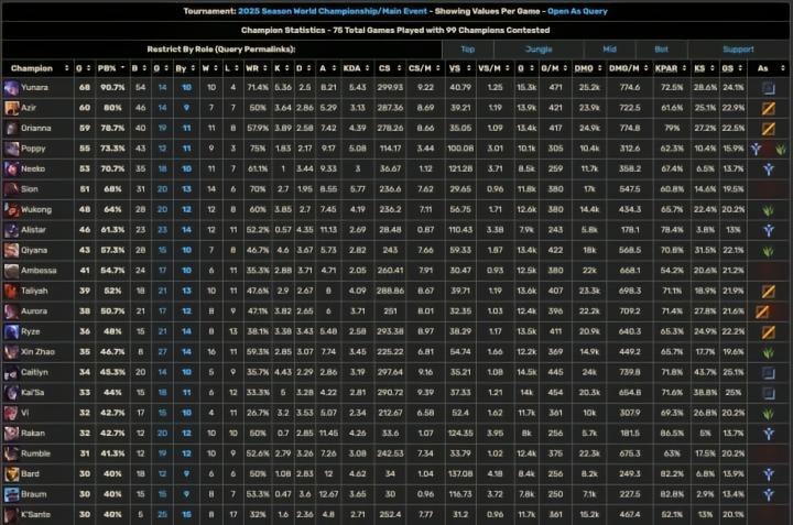 英雄联盟S15世界赛已经进入尾声,11月9日我们将在最终的决赛中见证一场T1与KT的LCK内战。截至目前,芸阿娜成为了S15正赛中BP率最高的英雄,达到90.7%。
