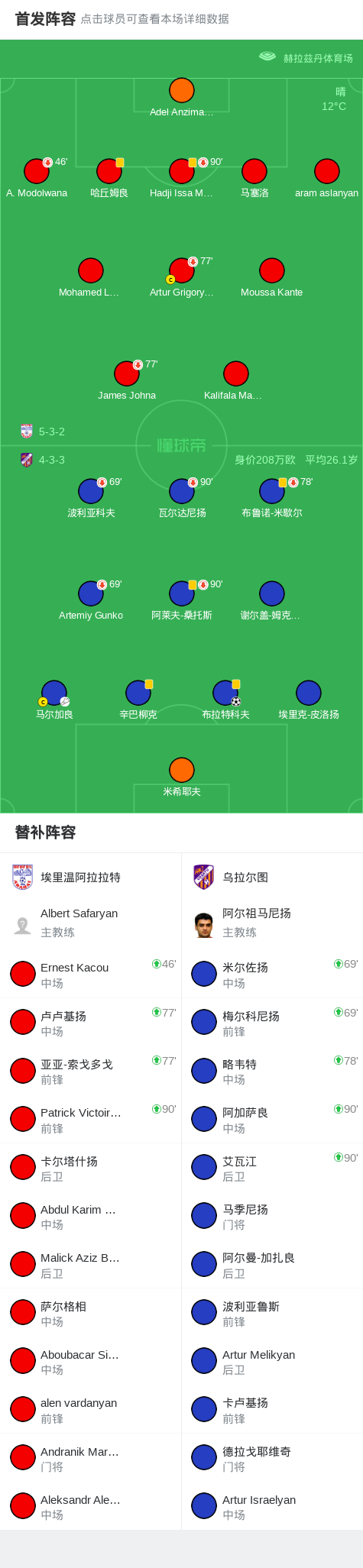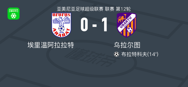 北京时间11月3日亚美尼亚足球超级联赛 联赛 第12轮,埃里温阿拉拉特主场对阵乌拉尔图。乌拉尔图布拉特科夫破门。最终比分埃里温 0-1 乌拉尔图。