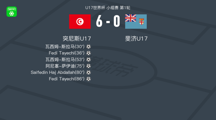 突尼斯U17 6-0狂胜斐济U17,瓦西姆-斯拉马两球,Fedi Tayechi两球