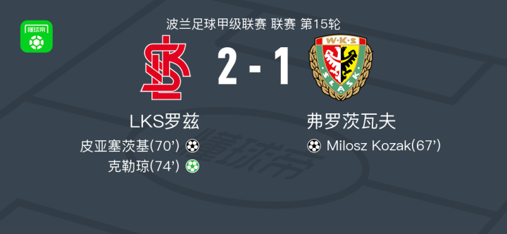 罗德茨2-1逆转弗罗茨瓦夫,克勒琼点射,皮亚塞茨基建功