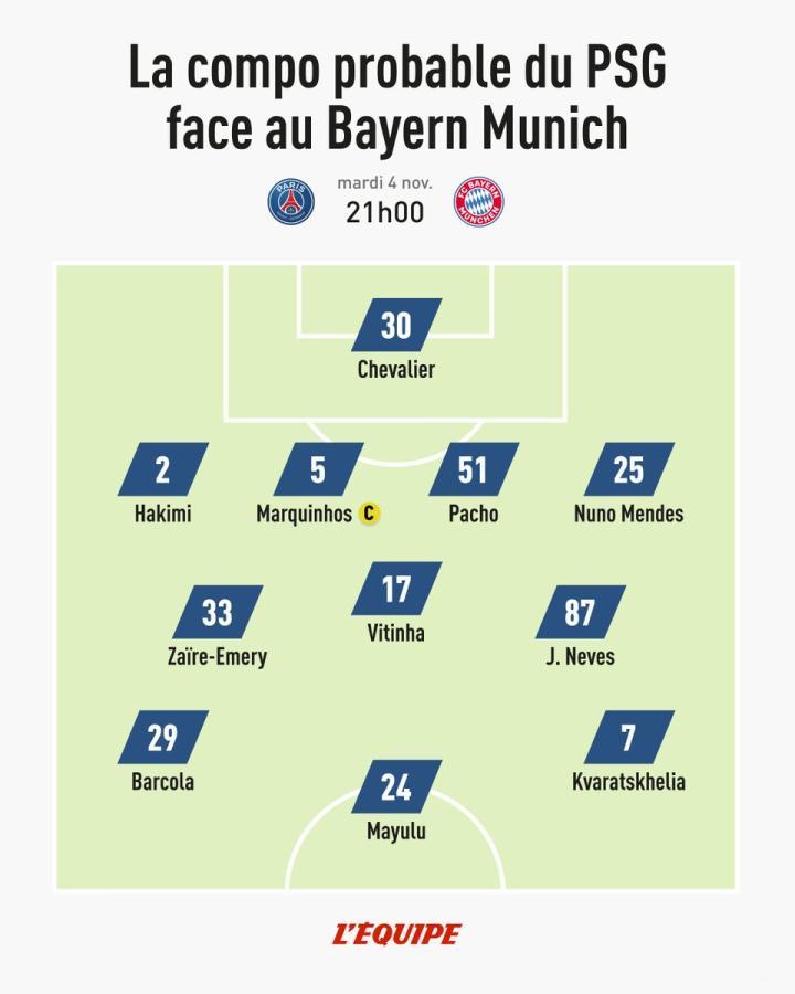 北京时间明天凌晨4点,巴黎圣日耳曼将迎来欧冠联赛阶段第4轮主场对阵拜仁慕尼黑的比赛,赛前,《队报》对巴黎的首发阵容进行了预测,其中巴尔科拉、克瓦拉茨赫利亚、维蒂尼亚、努诺-门德斯、帕乔、阿什拉夫等人在列。