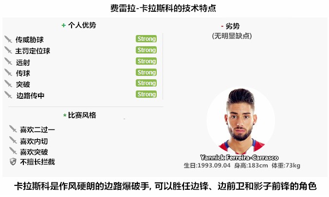 (卡拉斯科在肋部的钻营能力很强,能够在对抗情况下保证动作不变形,开阔空间内的单兵防守对他来说是形同虚设的。)