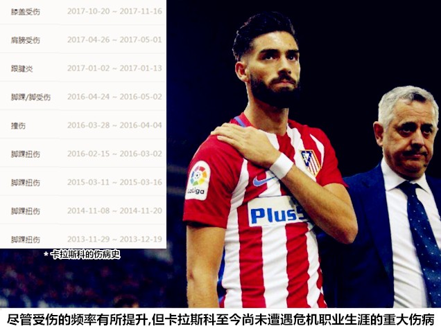 从2015/16赛季后期开始,卡拉斯科打满90分钟的比赛越来越多,扛人突破和遭遇包夹时控制皮球对他来说已经不是难事,频繁地在高速持球推进中将球从左脚顺到右脚后完成射门,也体现出了其核心力量升级后对身体控制力的加强。不过,硬朗球风的形成也让卡拉斯科开始频繁遭受伤病的侵袭,在连续三年因脚踝伤势休战之后,跟腱炎、肩膀和膝盖的伤势也在近一个赛季以来成为了困扰比利时人的新问题。
