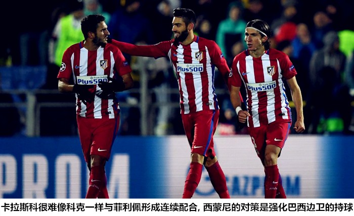 在球队从云端极速坠落的过程中,GGC组合早已失去了当初合体时的光芒:风格单一的加梅罗容易被对手限制,法国人的价值随着其屡失单刀而急剧萎缩;格列兹曼成功转型为9号半但受限于踢球特点和能力,只适合承担简单的衔接和串联任务,转会流言让他在很多时候显得缺少足够的热情和积极性。出现在边前卫区域的卡拉斯科必须要承担起他并不擅长大量的边路局部传切,比利时人最擅长的位置还是可以直接冲击对手防线的边锋,他的技术功底、组织能力和大局观暂时还无法胜任区域核心的角色。西蒙尼进一步增加菲利佩的组织权重固然能够卸去卡拉斯科的压力,但在高位接球后面对密集防守显然也不是其最擅长的比赛方式。
