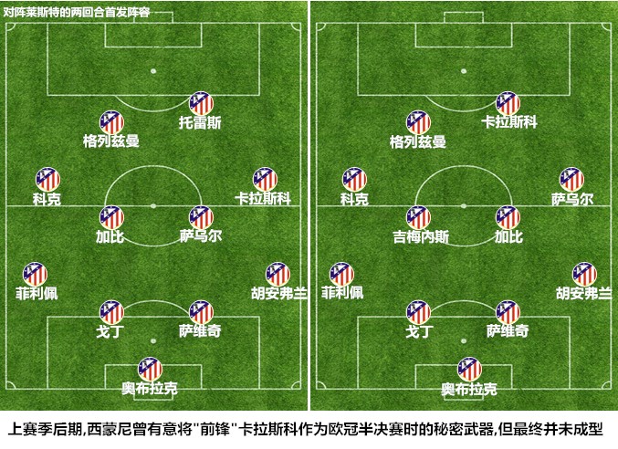 从上赛季欧冠1/4决赛对阵莱斯特开始,西蒙尼其实就已经放弃了“边前卫”卡拉斯科,阿根廷人在做客皇权球场的比赛中试验了以吉梅内斯为中前卫的全新442阵型。身体素质劲爆的乌拉圭人在中场展现出了一流扫荡者的潜质,他大范围跑动截击和出色的屏障作用,不仅有效地遏制了对手的反击,为加比和萨维奇等人争取到了更多的落位时间,在中前卫位置表现挣扎的科克回到了他所熟悉的左路,卡拉斯科被推上了阵型顶端作为反击箭头。令人遗憾的是,枯坐了大半个赛季冷板凳的吉梅内斯似乎无法承受突如其来的压力。乌拉圭人在欧冠半决赛开打之前受伤似乎就是天意,这提前终结了西蒙尼的终极试验,卡拉斯科回到了他所“熟悉”的位置上,他在马竞的轨迹自此彻底转入下行区间。