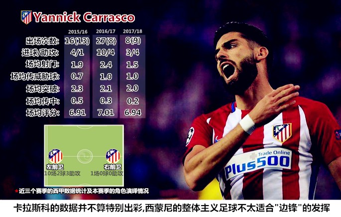 舆论的担心是不无道理的,卡拉斯科在摩纳哥时期无法获得稳定的主力位置,其原因之一就是他很难在雅尔迪姆的442体系中找到位置,作为第12人在下半场冲击对手的疲惫防线成为了他的职责。葡萄牙主帅在打弱队时会祭出433阵型,卡拉斯科只有在这时候才能与马夏尔和贝尔巴托夫在锋线搭档。西蒙尼的442/4222体系对中场边路的球员要求更为严格,他们在一场比赛中需要完成大量紧贴边路的往返跑。在进攻中利用传中支援双前锋、在防守端配合边后卫绞杀对手边锋,射门和突破并非要诀,体能和硬度才是关键,这对已经习惯了不防守和埋头带球的比利时人来说并不容易。