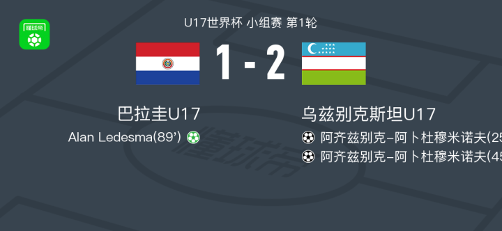 北京时间11月5日,U17世界杯小组赛第一轮展开较量,巴拉圭U17与乌兹别克斯坦U17狭路相逢。比赛中,乌兹别克斯坦U17率先打破僵局,阿齐兹别克-阿卜杜穆米诺夫接舒库鲁拉耶夫助攻完成破门。随后在上半场补时阶段,穆萨霍诺夫送出助攻,阿齐兹别克-阿卜杜穆米诺夫再下一城,实现个人梅开二度。比赛进入尾声阶段,巴拉圭U17获得点球机会,Alan Ledesma主罚命中,为球队扳回一城。最终全场比分定格为1比2,乌兹别克斯坦U17取得胜利。