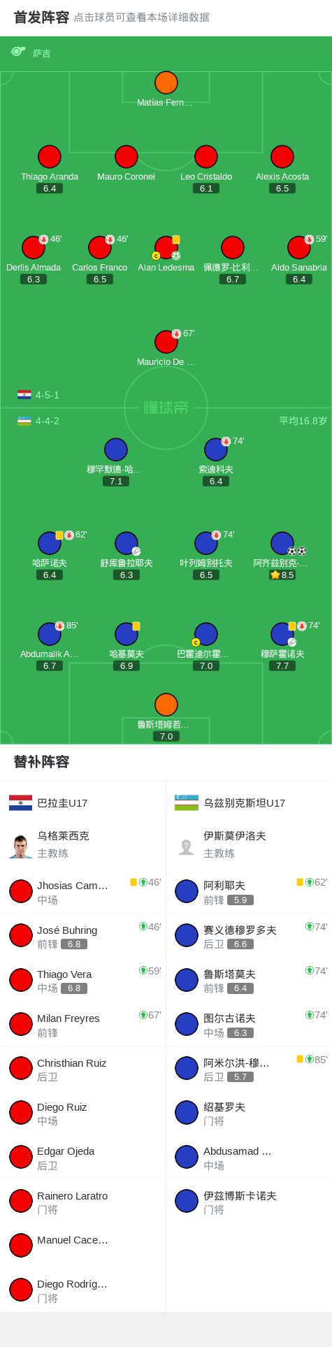 乌兹别克斯坦U17 2-1巴拉圭U17,阿齐兹别克-阿卜杜穆米诺夫包办2球