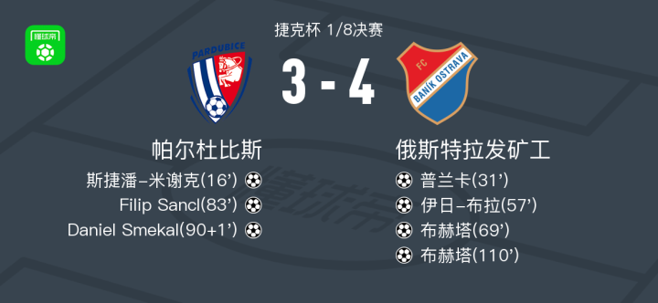 第110分钟,俄斯特拉发矿工球员布赫塔打入一球。