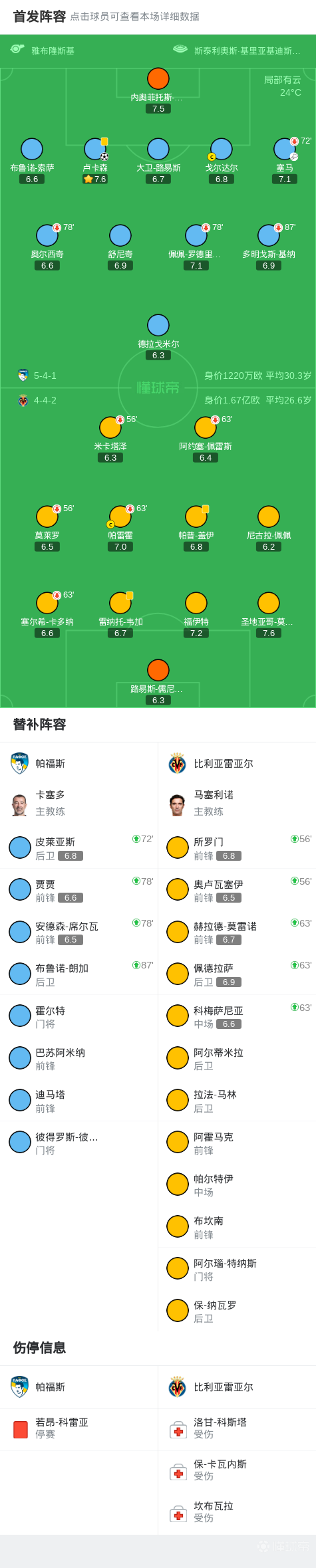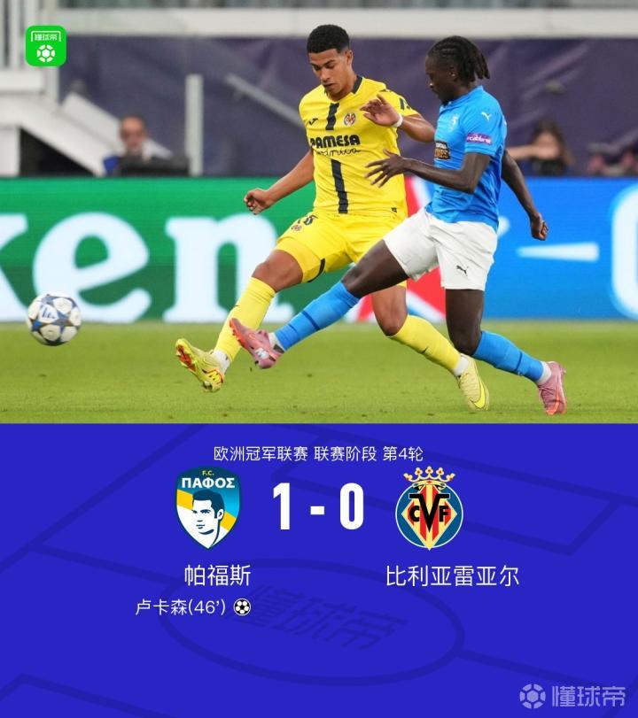 第46分钟,塞马开出角球,卢卡森头球破门,帕福斯1-0比利亚雷亚尔