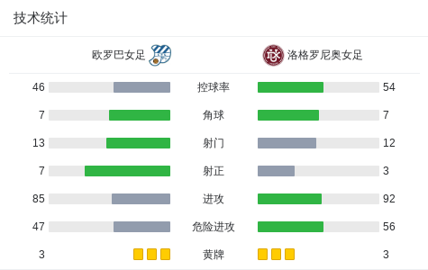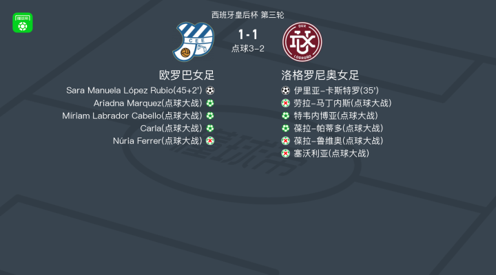 北京时间11月6日西班牙皇后杯 第三轮,欧罗巴女足对阵洛格罗尼奥女足。欧罗巴女足Sara Manuela López Rubio破门。洛格罗尼奥女足伊里亚-卡斯特罗破门。最终比分欧罗巴女足 4-3 洛格罗尼奥女足。