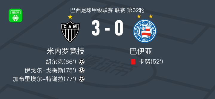北京时间11月6日,巴西足球甲级联赛第32轮,米内罗竞技主场迎战巴伊亚。比赛中,巴伊亚球员卡努被罚离场。随后,胡尔克为米内罗竞技打破僵局,伊戈尔-戈梅斯再下一城扩大领先优势。罗尼送出助攻,加布里埃尔-特谢拉接球后破门得分。最终,米内罗竞技以3比0战胜巴伊亚。