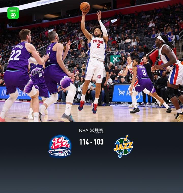 第四节活塞坎宁安拿下28分,爵士马尔卡宁拿下23分,最终活塞114-103战胜爵士