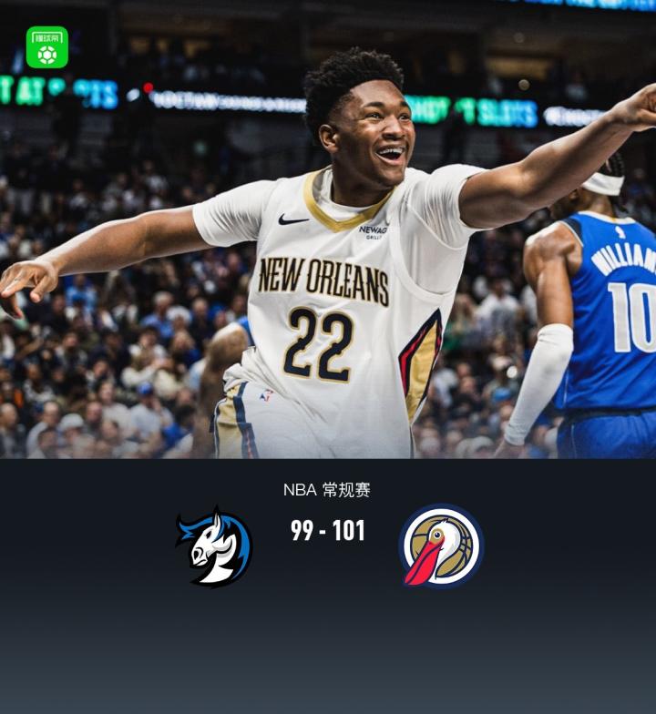 第四节独行侠加福德拿下9分,鹈鹕特雷-墨菲拿下4分,最终独行侠99-101不敌鹈鹕