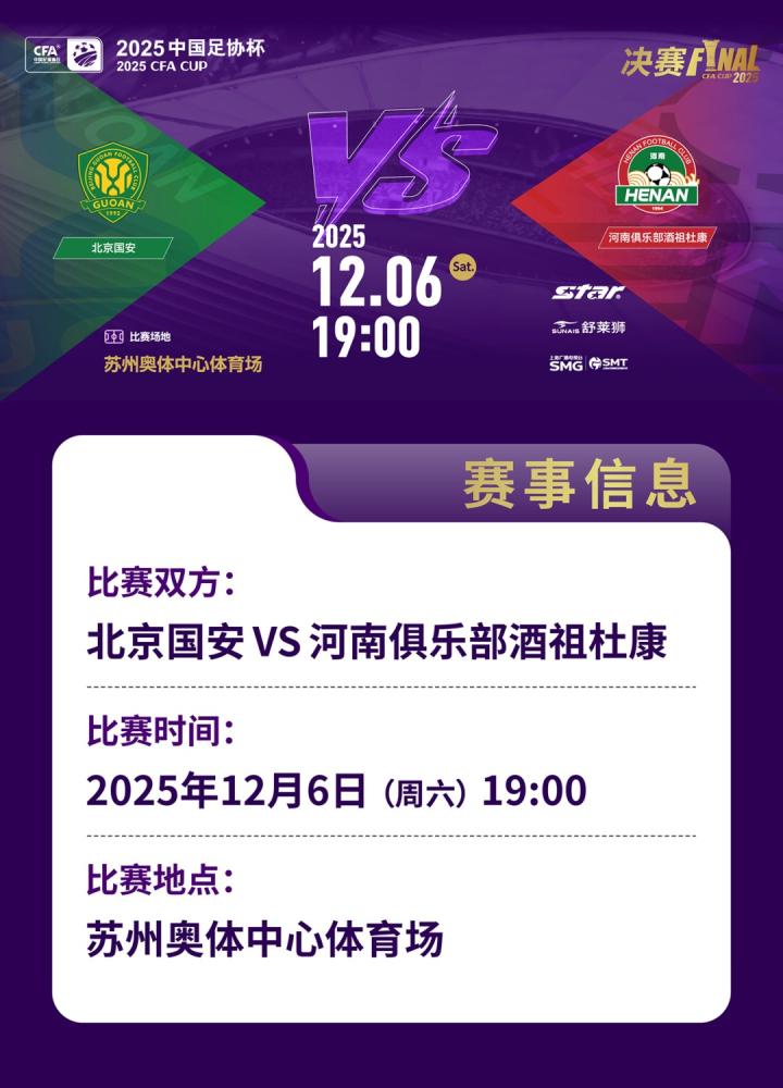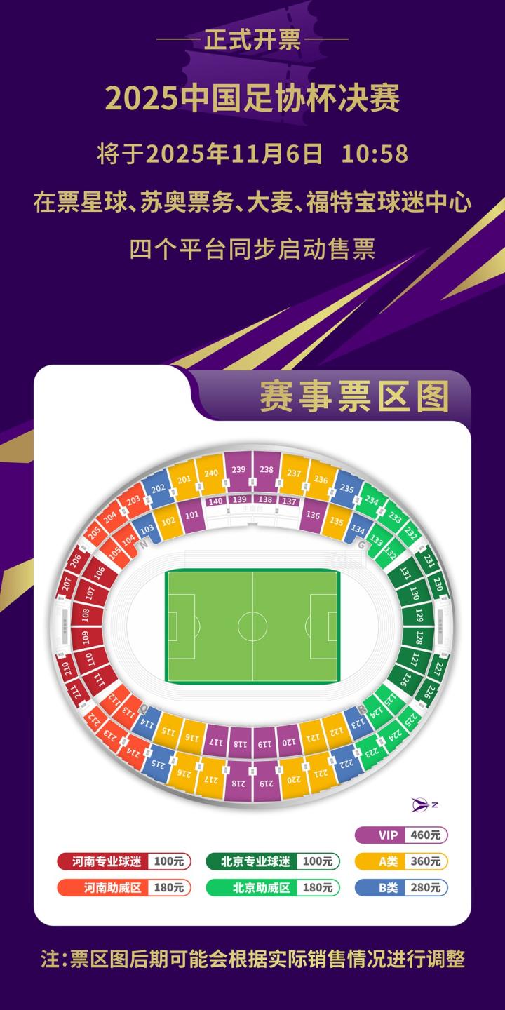 北京时间11月6日上午,2025赛季中国足协杯决赛北京国安对阵河南俱乐部酒祖杜康的门票已经正式开售。