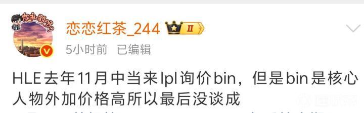 “恋恋红茶”在社媒写道:“HLE去年11月中来lpl询价bin,但是bin是核心人物外加价格高所以最后没谈成。”
