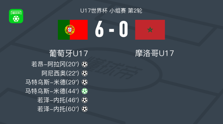 北京时间11月6日U17世界杯 小组赛 第2轮,葡萄牙U17对阵摩洛哥U17。葡萄牙U17若昂-阿拉冈破门,阿尼西奥破门,马特乌斯-米德梅开二度,若泽-内托梅开二度。最终比分葡萄牙U17 6-0 摩洛哥U17。