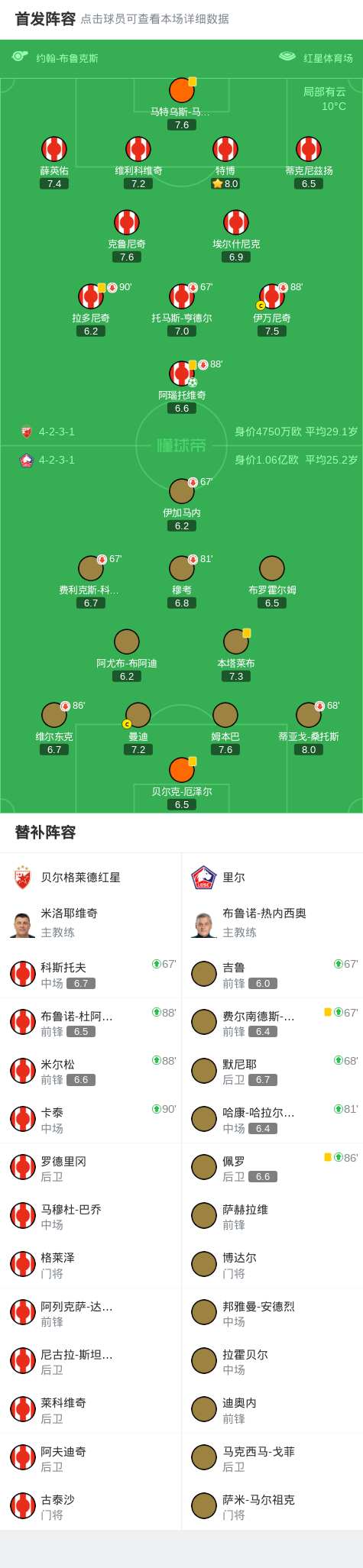 贝尔格莱德红星1-0里尔,阿瑙托维奇绝杀战报bot @懂球帝2025-11-07 03:41在欧足联欧洲联赛联赛阶段第4轮的较量中,贝尔格莱德红星迎战里尔。比赛中,阿瑙托维奇主罚点球命中,为球队打入制胜进球。凭借此次破门,贝尔格莱德红星以1-0战胜对手,全取三分。点击查看本场比赛详细数据>>点击查看欧联完整积分榜>>精彩瞬间第85分钟,贝尔格莱德红星球员阿瑙托维奇罚入点球。 球队阵容 技术统计 展开更多