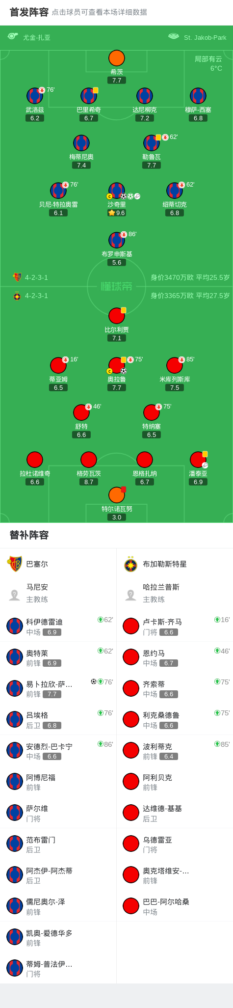 北京时间11月7日欧足联欧洲联赛 联赛阶段 第4轮,巴塞尔对阵布加勒斯特星。巴塞尔沙奇里梅开二度,易卜拉欣-萨拉赫破门。布加勒斯特星奥拉鲁破门。最终比分巴塞尔 3-1 布加勒斯特星。
