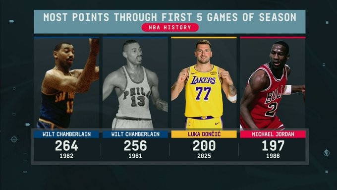 历史第二人,东契奇赛季前5场砍200分,超越乔丹仅次于张伯伦