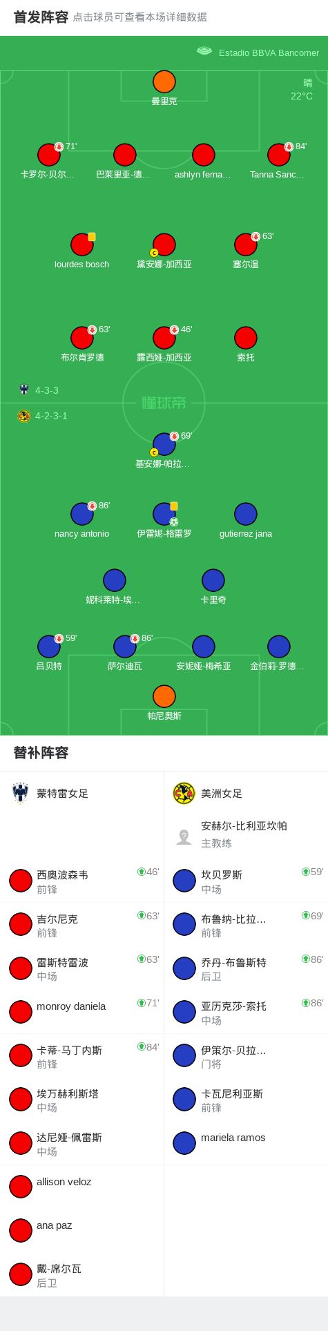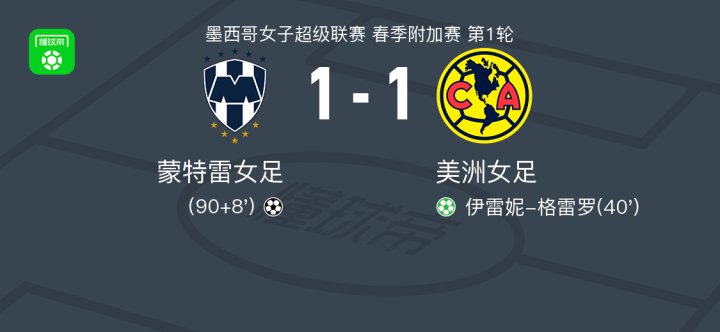 90分钟战报:蒙特雷女足1-1战平美洲女足,双方进入加时赛战报bot @懂球帝2025-11-07 11:17北京时间11月7日墨西哥女子超级联赛 春季附加赛 第1轮,蒙特雷女足主场对阵美洲女足。美洲女足伊雷妮-格雷罗破门。常规时间双方1-1战平,将进入加时赛。点击查看本场比赛详细数据>>精彩瞬间第40分钟,美洲女足球员伊雷妮-格雷罗罚入点球。下半场补时第8分钟,蒙特雷女足球员打入一球。 球队阵容 技术统计 展开更多