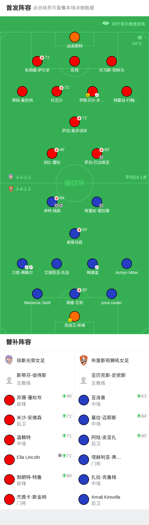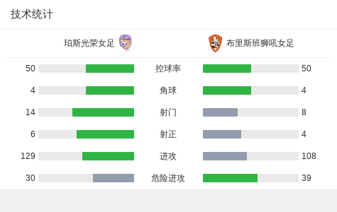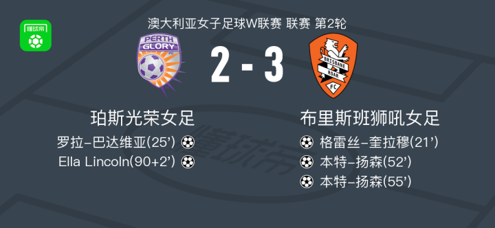 北京时间11月7日澳大利亚女子足球W联赛 联赛 第2轮,珀斯光荣女足主场对阵布里斯班狮吼女足。珀斯光荣女足罗拉-巴达维亚破门,Ella Lincoln破门。布里斯班狮吼女足格雷丝-奎拉穆破门,本特-扬森梅开二度。最终比分珀斯光荣女足 2-3 布里斯班狮吼女足。