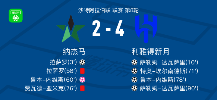 北京时间11月8日沙特阿拉伯联 联赛 第8轮,纳杰马主场对阵利雅得新月。纳杰马拉萨罗破门。利雅得新月萨勒姆-达瓦萨里梅开二度,特奥-埃尔南德斯破门,鲁本-内维斯破门,鲁本-内维斯自摆乌龙。最终比分纳杰马 2-4 利雅得新月。