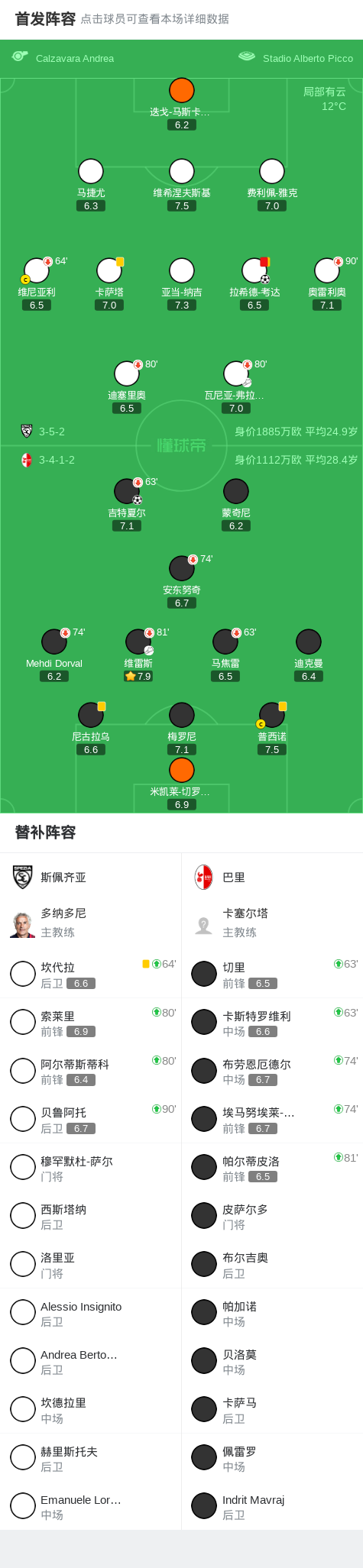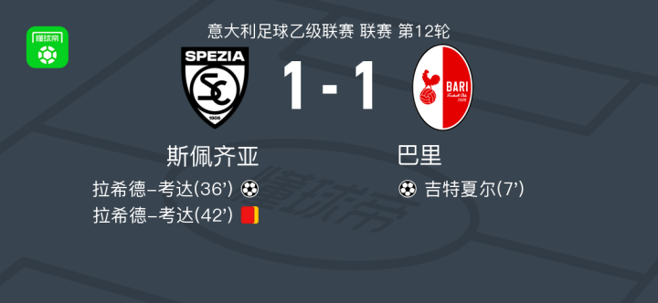 斯佩齐亚1-1巴里,吉特夏尔先拔头筹,拉希德-考达扳平