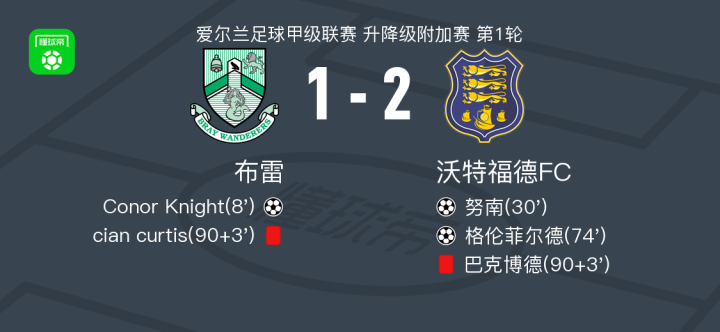 北京时间11月8日,爱尔兰足球甲级联赛升降级附加赛首轮,布雷坐镇主场迎战沃特福德FC。比赛开局阶段,布雷率先打破僵局,Conor Knight破门得分,为主队取得领先。此后沃特福德FC展开反击,通过连续配合由努南将球送入对方网窝,扳平比分。进入下半场,沃特福德FC持续施压,格伦菲尔德接队友传球后冷静施射,帮助球队实现反超。比赛临近结束进入补时阶段,双方各有一名球员被红牌罚下,Cian Curtis与巴克博德因犯规动作双双离场。最终全场比赛结束,布雷以1-2不敌沃特福德FC。