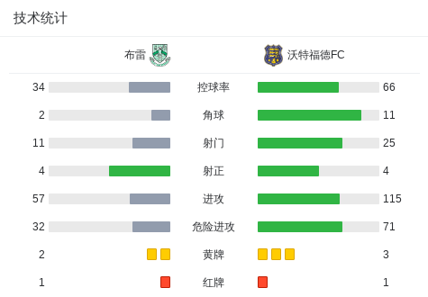 下半场补时第3分钟,沃特福德FC球队巴克博德吃到红牌。