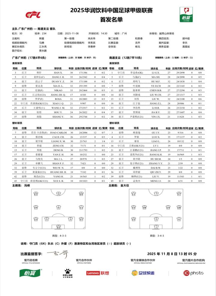北京时间11月8日14:30,中甲联赛第30轮,广东广州豹主场对阵南通支云,本场比赛主裁判是熊星,VAR是马腾,赛前双方公布首发: