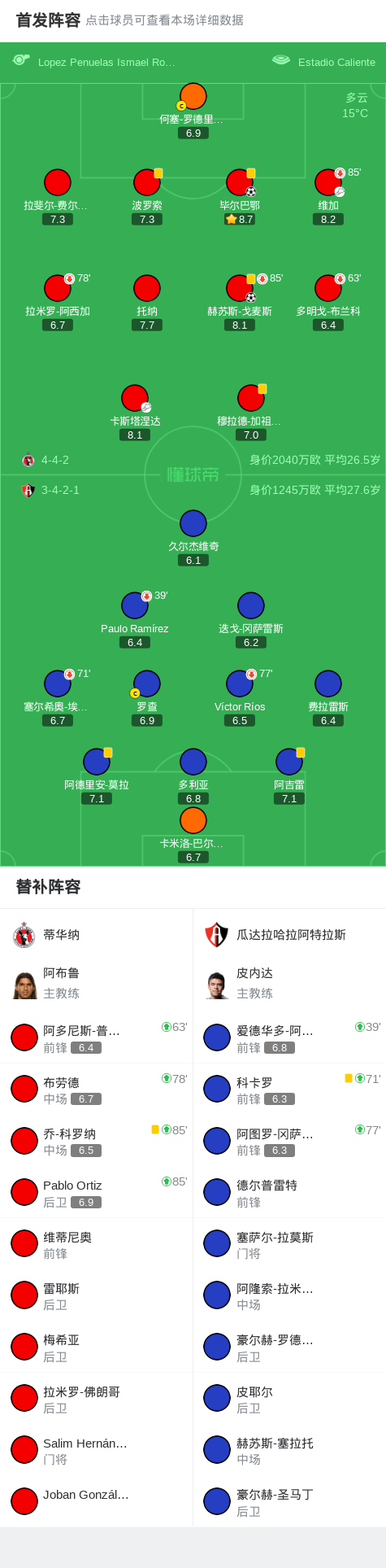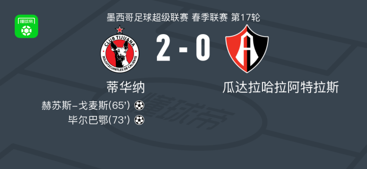 蒂华纳2-0瓜达拉哈拉阿特拉斯,赫苏斯-戈麦斯破门,毕尔巴鄂锦上添花