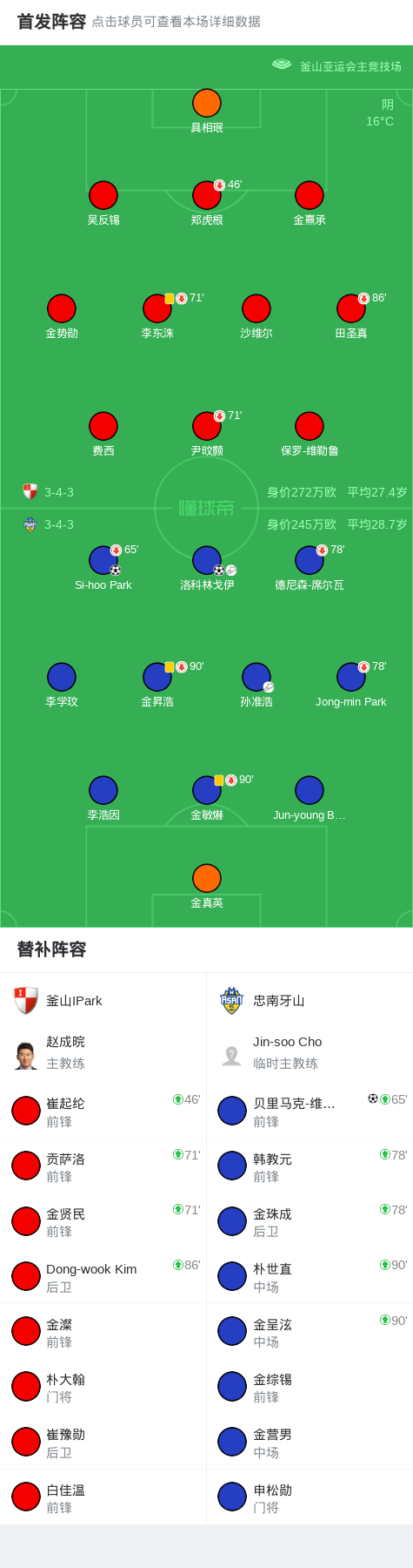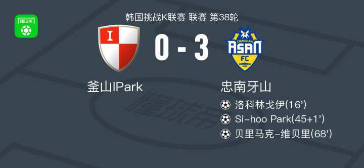 北京时间11月8日韩国挑战K联赛 联赛 第38轮,釜山IPark主场对阵忠南牙山。忠南牙山洛科林戈伊破门,Si-hoo Park破门,贝里马克-维贝里破门。最终比分釜山IPark 0-3 忠南牙山。