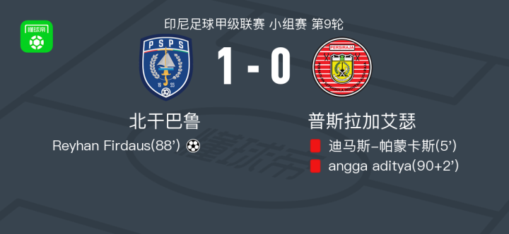 北京时间11月8日印尼足球甲级联赛 小组赛 第9轮,北干巴鲁主场对阵普斯拉加艾瑟。北干巴鲁Reyhan Firdaus破门。最终比分北干巴鲁 1-0 佩希拉亚。