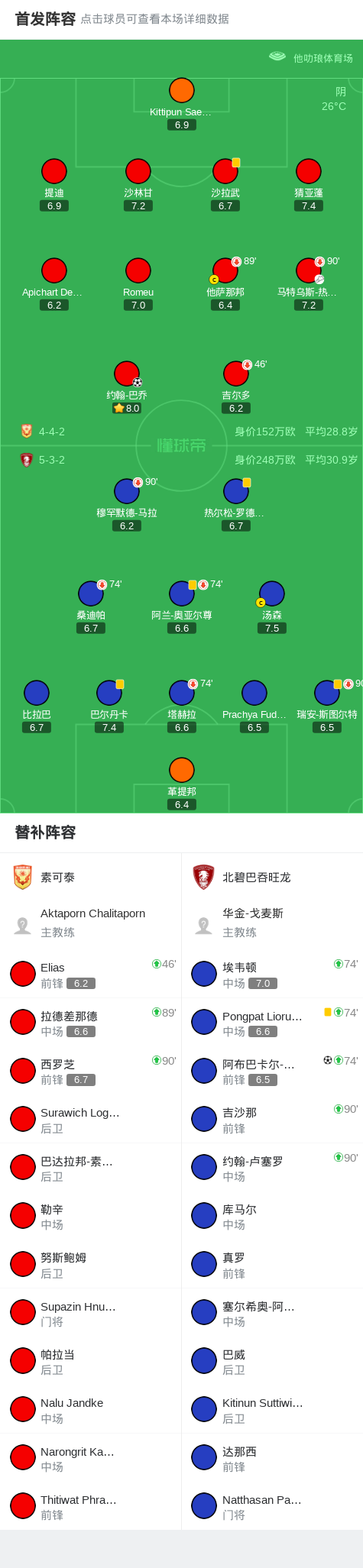 北京时间11月8日,泰国超级联赛第11轮展开较量,素可泰坐镇主场迎战北碧巴吞旺龙。比赛中,素可泰率先打破僵局,马特乌斯-热苏斯送出助攻,约翰-巴乔成功破门,为主队取得领先。此后双方均积极组织进攻,北碧巴吞旺龙在下半场由阿布巴卡尔-卡马拉攻入关键一球,将比分扳平。最终全场结束,双方以1-1握手言和。