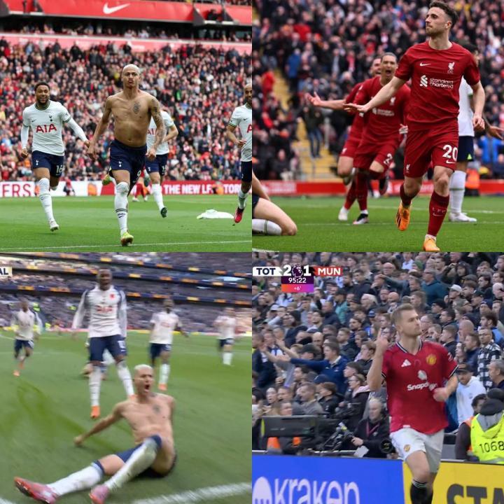 比赛第91分钟,奥多贝尔禁区外远射,里沙利松头球一蹭将球顶进了球门,帮助热刺将比分反超为2-1,进球后,他激动地脱衣庆祝,但随后德利赫特完成绝平。