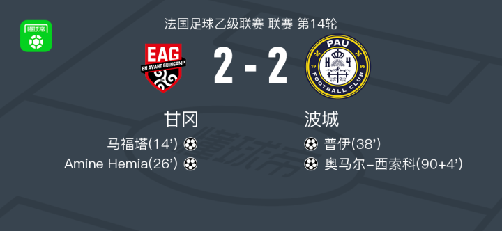 北京时间11月8日,法国足球乙级联赛第14轮展开较量,甘冈坐镇主场迎战波城。比赛中,甘冈率先打破僵局,马福塔接队友传球后冷静施射得手,为球队取得领先。随后,Amine Hemia延续进攻势头,再下一城,帮助主队扩大优势。波城并未放弃,普伊在一次高效配合中完成破门,将比分迫近。进入下半场补时阶段,波城球员奥马尔-西索科抓住机会打入关键一球,最终双方以2比2握手言和。
