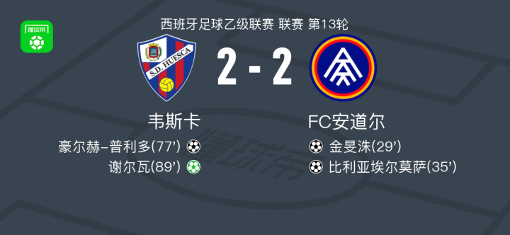 韦斯卡2-2FC安道尔,金旻洙破门,谢尔瓦扳平