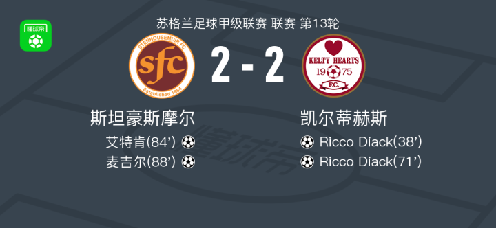北京时间11月8日,苏格兰足球甲级联赛第13轮展开较量,斯坦豪斯摩尔主场迎战凯尔蒂赫斯。比赛中,凯尔蒂赫斯率先打破僵局,约翰斯顿送出助攻,Ricco Diack完成破门。此后Ricco Diack再次建功,帮助球队扩大领先优势。斯坦豪斯摩尔随后展开反击,Kinlay Bilham送出助攻,艾特肯为球队扳回一城。比赛尾声阶段,麦吉尔挺身而出,攻入关键进球,将比分最终定格。全场结束,双方以2-2握手言和。