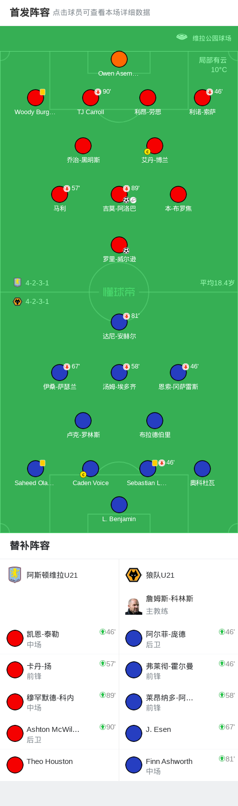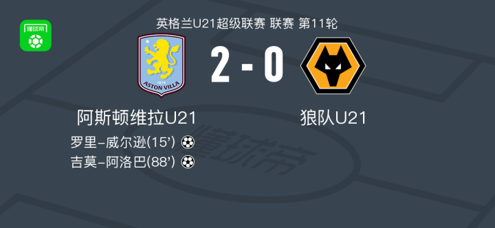 北京时间11月9日英格兰U21超级联赛 联赛 第11轮,阿斯顿维拉U21主场对阵狼队U21。阿斯顿维拉U21罗里-威尔逊破门,吉莫-阿洛巴破门。最终比分阿斯顿维拉U21 2-0 狼队U21。