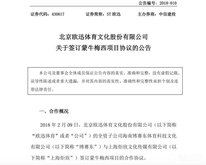 圈哥了解到,欧迅体育2月9日曾发布公告称,其全资子公司海南博赛东体育科技文化有限公司与上海炬欣文化传媒有限公司签订蒙牛梅西项目的合作协议,依托各自所擅长的娱乐、体育营销资源开展业务合作,本次就“蒙牛与阿根廷足球运动员里奥梅西的代言服务”达成合作,圆满促成蒙牛赞助梅西项目。