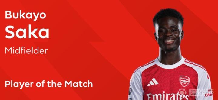 进球助阿森纳客场2-2战平桑德兰,萨卡当选全场最佳球员